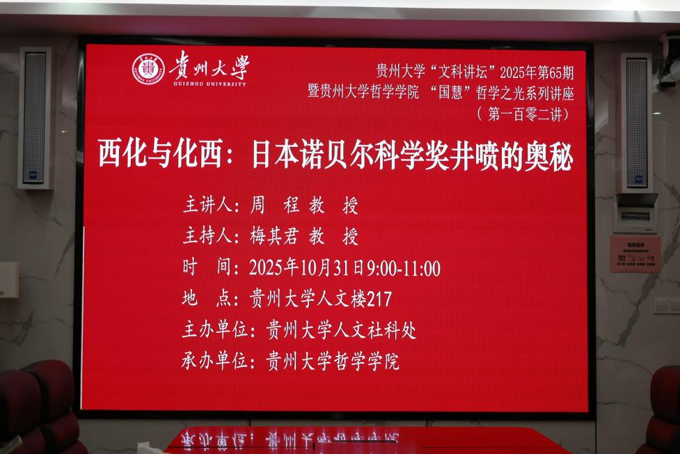 2025年10月31日上午,贵州大学“文科讲坛”第65期暨哲学学院“国慧”哲学之光系列讲座第一百零二讲于贵州大学人文楼217会议室成功开讲。北京大学哲学系教授周程作了以《西化与化西:日本诺贝尔科学奖井喷的奥秘》为题的讲座。讲座由贵州大学哲学学院副院长梅其君教授主持。
