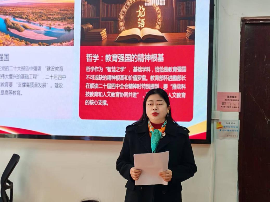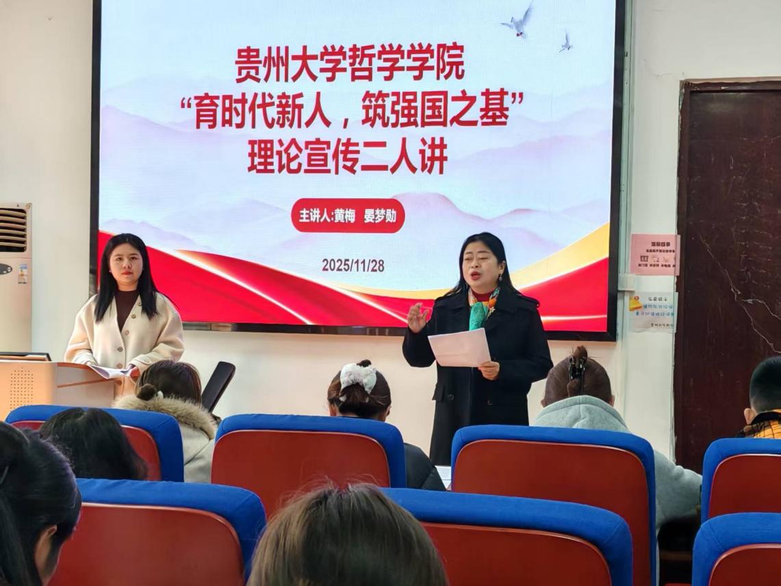 为深入学习贯彻党的二十大和二十届四中全会精神,解答AI时代哲学专业学子的发展困惑,明晰哲学学科的时代价值与青年使命,2025年11月28日,哲学学院本科生党支部以“育时代新人、筑强国之基”为主题,开展“理论宣传二人讲”活动。活动由哲学学院党委书记黄梅、本科生党支部书记晏梦勋主讲,她们结合学科发展实践与学子成长案例,让理论宣讲既有思想高度,又有青春温度,推动党的创新理论在青年学子中入脑入心。