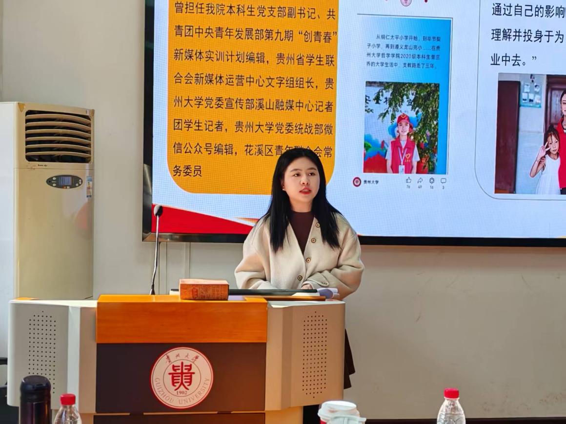围绕“哲学如何对接强国建设实践”的核心问题,黄梅书记从政策导向与学院发展双维度展开解读。从政策层面,党的二十大指出,教育、科技、人才是全面建设社会主义现代化国家的基础性、战略性支撑。哲学作为基础学科,能为个人、企业、国家发展规避方向偏差,是高质量发展的隐形支撑。从实践层面,哲学学院近年学科建设成果显著:哲学学科软科排名跃升明显;成功引进甘绍平教授等国家级人才,青年博士斩获4项国家社科基金项目;智库专报获中央领导批示等成果。此外,学院育人质量稳居前列:连续三年在贵州大学目标考核中获A等次,获评“五四红旗团委”“征兵工作先进单位”“博学计划先进单位”资助育人主题活动三等奖、优秀奖,心理健康月活动优秀组织奖等荣誉,学生继续深造率居高不下,学院引导学生做好境内升学、就业或境外深造的长期规划,形成良性育人闭环。