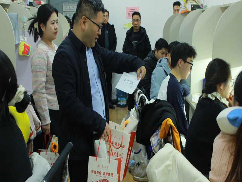 时值深冬,书韵温存。为鼓舞考研学子斗志,缓解备考压力,坚定冲刺信心,2025年12月8日下午15:00,哲学学院组织师生为考研学子送温暖。贵州大学党委常委、副校长陈艳波教授带领学院党政领导以及师生代表一同前往学院考研自习室,为正在紧张复习的同学们送上暖心礼包与亲切鼓励。