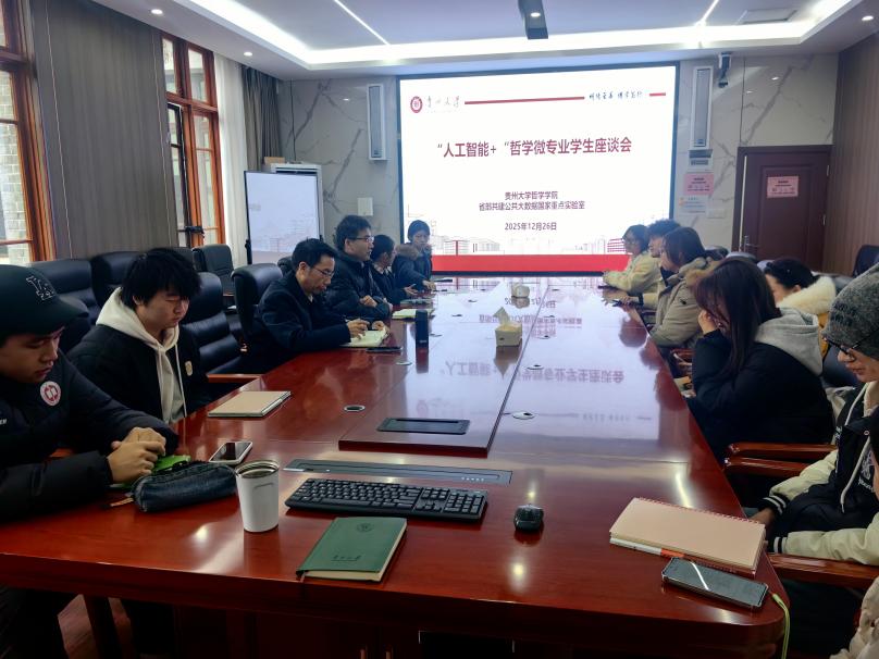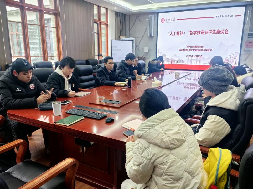 为推动“‘人工智能+’哲学”微专业顺利开设,了解学生对于微专业开设的实际诉求,凝聚师生共建共识,2025年12月26日上午10点,贵州大学哲学学院联合省部共建公共大数据国家重点实验室在人文楼217召开“‘人工智能+’哲学”微专业学生座谈会。本次座谈会围绕微专业建设核心问题展开深度交流,为跨学科人才培养凝聚智慧力量。哲学学院院长龚晓康、党委副书记赵栋昌、学生科科长晏梦勋,哲学学院、传媒学院、大数据与信息工程学院学生代表参会。会议由哲学学院院长龚晓康主持。