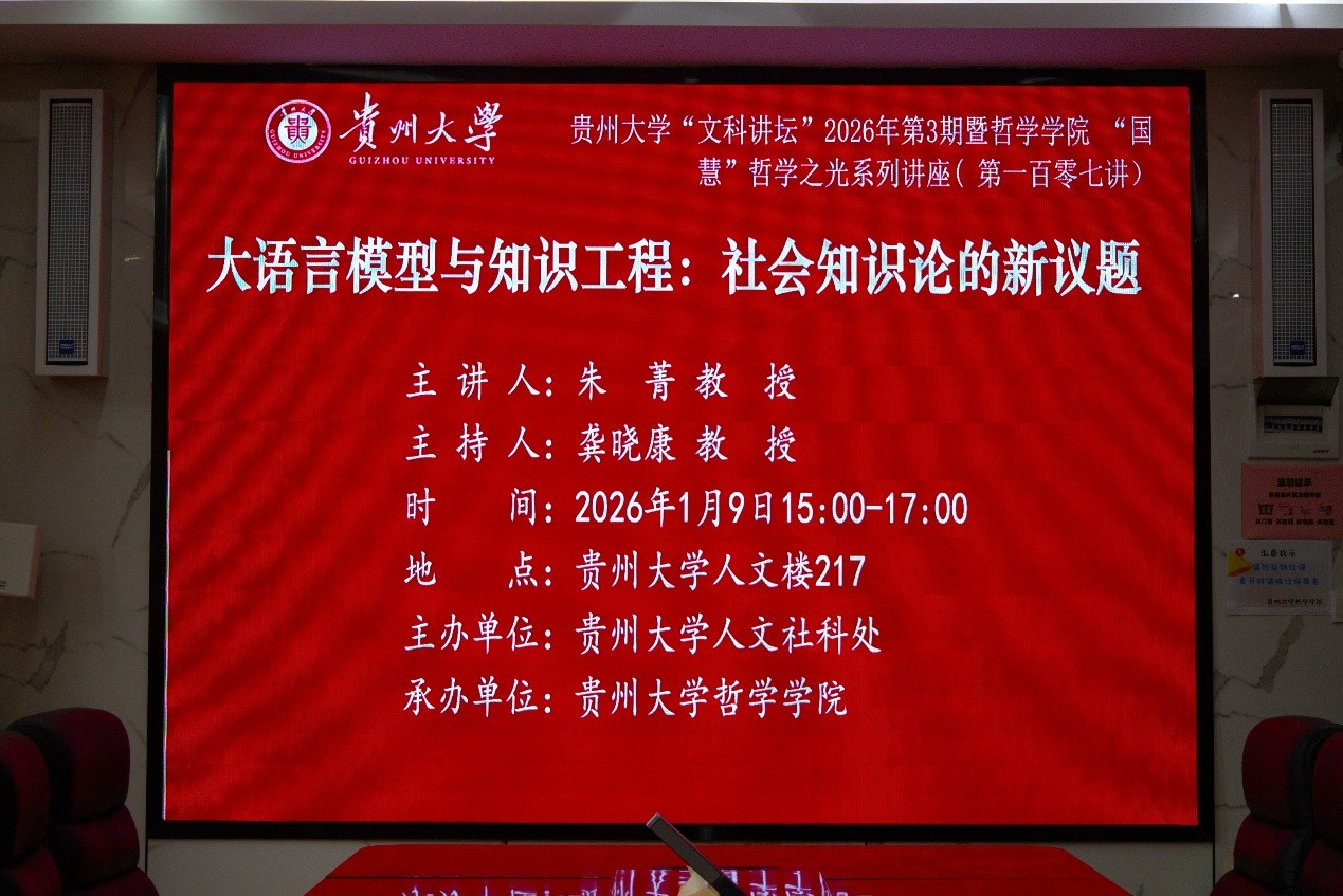 2026年1月9日下午15:00至17:00,贵州大学哲学学院“国慧”哲学之光系列讲座第107讲在东校区人文楼217会议室举行。本次讲座特邀厦门大学南强特聘教授朱菁担任主讲,主题为“大语言模型与知识工程:社会知识论的新议题”。讲座由贵州大学哲学学院院长龚晓康教授主持,现场吸引了近40名师生共同参与。