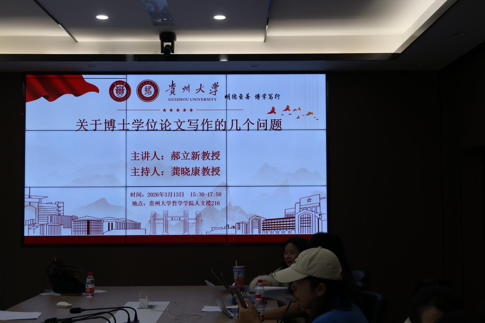 2026年3月13日下午,以《关于博士学位论文写作的几个问题》为题的讲座于贵州大学人文楼217会议室成功开讲,讲座由中国人民大学哲学系教授、贵州大学哲学学院名誉院长郝立新主讲,贵州大学哲学学院院长龚晓康主持,哲学学院全体博士生积极参与本次讲座。