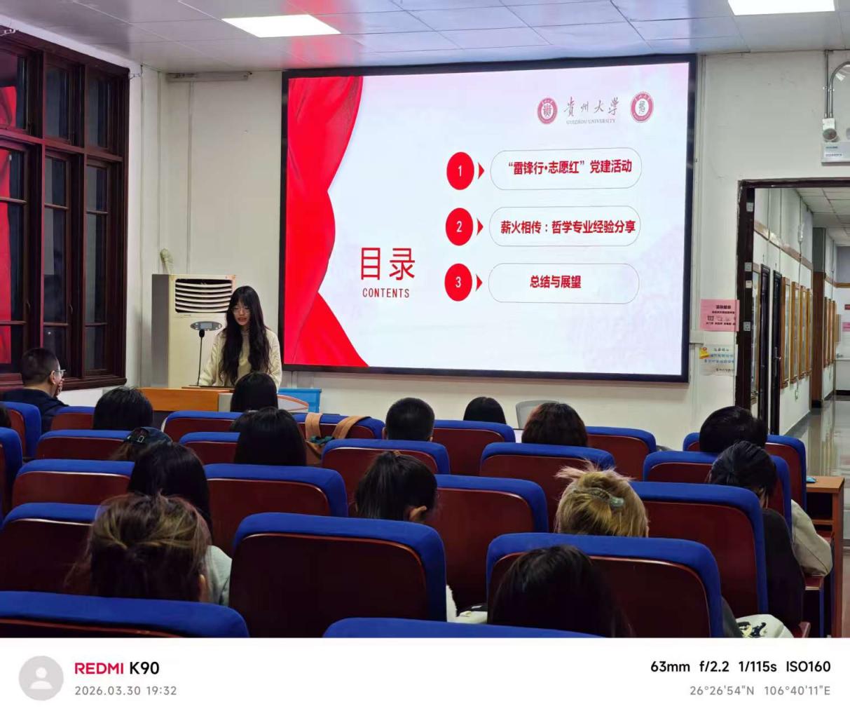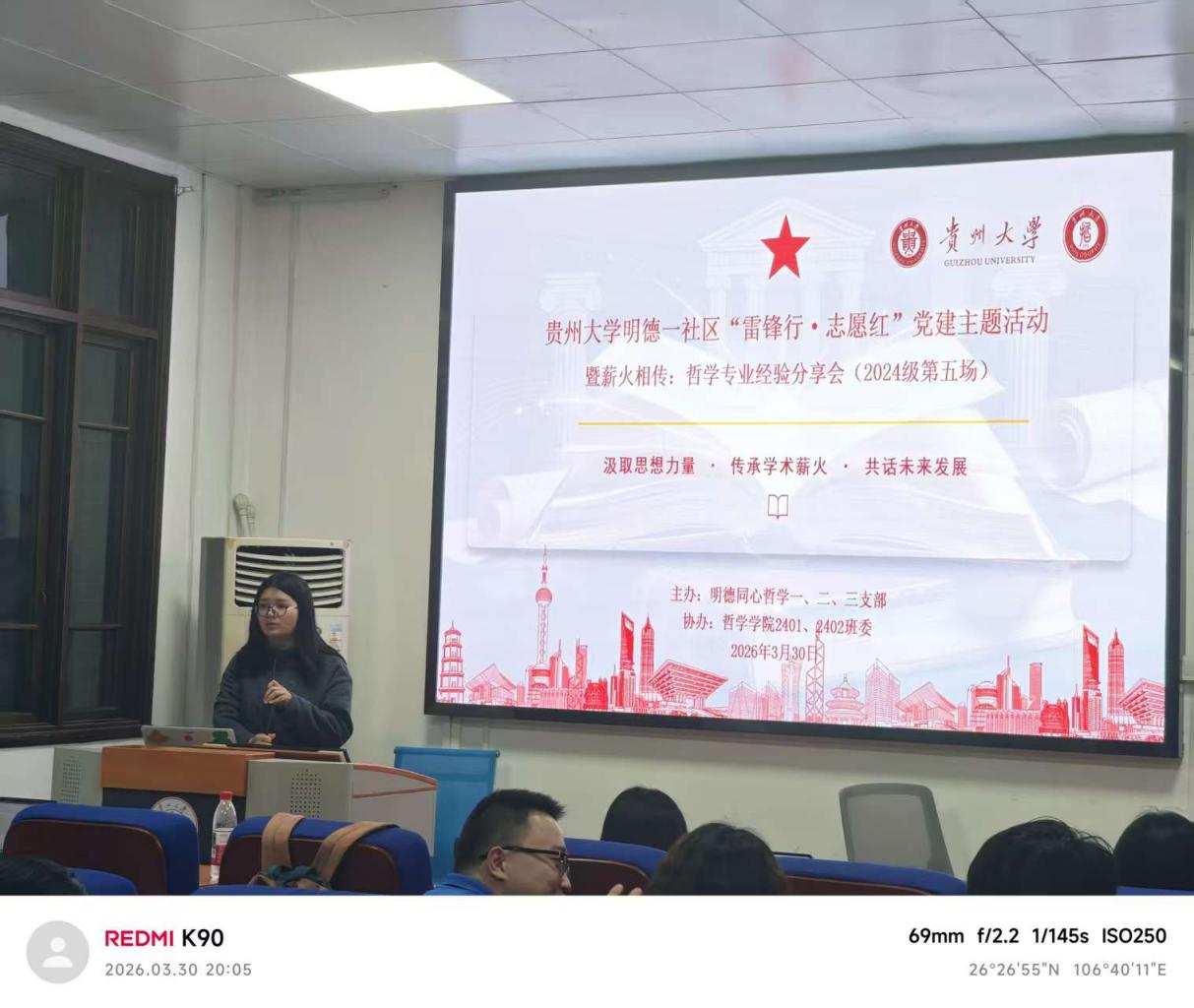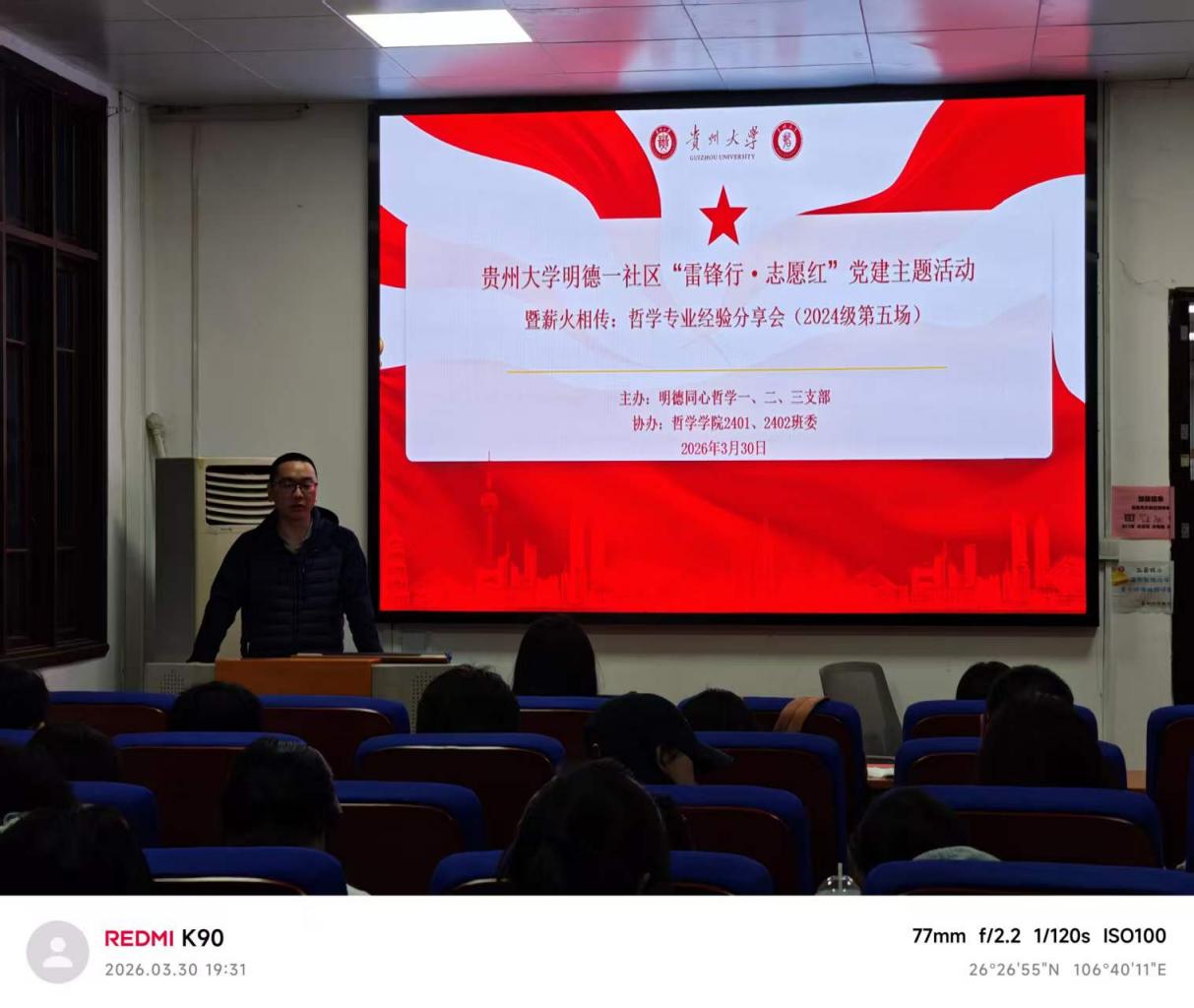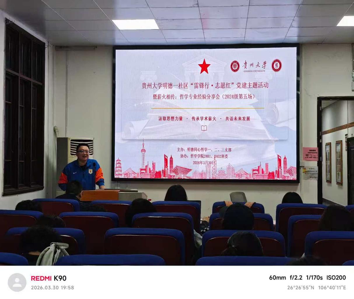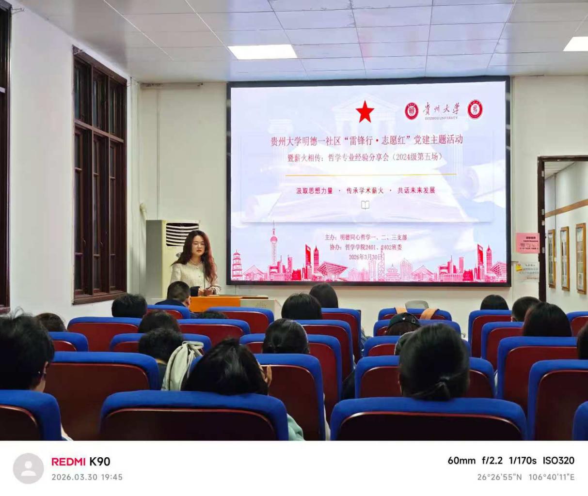 贵州大学“一站式”学生社区明德中心一社区哲学学院第2功能型党支部“雷锋行·志愿红”党建主题活动暨“薪火相传”哲学专业2024级第五场经验分享会圆满举办