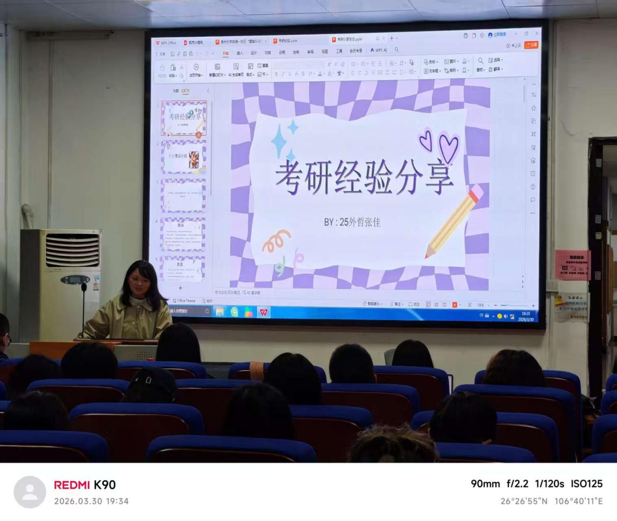 2026330日,明德中心一社区哲学学院第功能型党支部联合一、三功能型党支部,协同哲学学院24012402班委在东校区人文楼308圆满举办贵州大学明德中心一社区“雷锋行·志愿红”党建主题活动暨“薪火相传”哲学专业2024级第五场经验分享会。本次活动由明德中心一社区哲学学院第功能型党支部书记汤伟、功能型党支部书记吴敏共同策划组织2024全体同学到场参学习,四位研一党员同学分享考研升学的相关经验,部分二、三功能型党支部研究生党员参会。