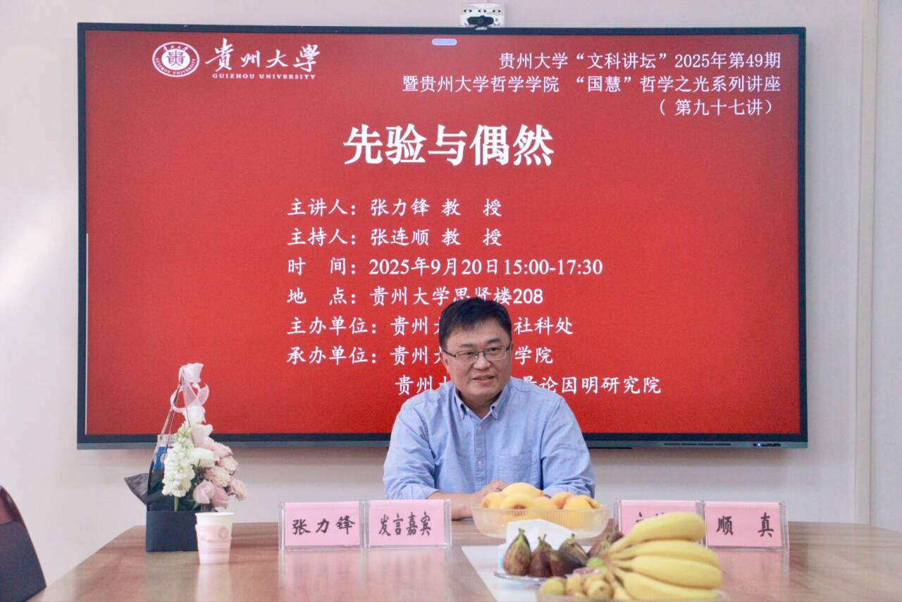2025年9月20日下午,贵州大学“文科讲坛”第49期暨哲学学院“国慧”哲学之光系列讲座第九十七讲于贵州大学思贤楼208会议室成功开讲。南京大学哲学学院博士生导师张力锋教授作了以《先验与偶然》为题的讲座。讲座由中国逻辑学会因明专业委员会主任、贵州大学佛教量论因明研究院院长、哲学学院博士生导师张连顺教授主持。