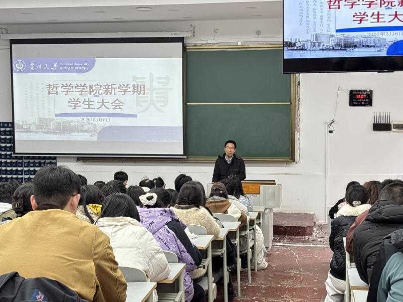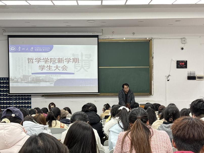 为统筹推进新学期学院教学与学生工作,引导全院学生收心归位,明确学业发展目标,筑牢校园发展与安全防线,2026年3月6日,我院在贵州大学东校区逸夫楼214召开了召开了哲学学院新学期学生大会。学院院长龚晓康、院党委副书记赵栋昌、学生科科长晏梦勋、研究生辅导员周千祝出席了本次会议,全体本科及研究生参会。本次会议就教学提升、学业规划、日常管理、安全建设等方面作出了全面部署安排。本次会议由学生科科长晏梦勋主持。